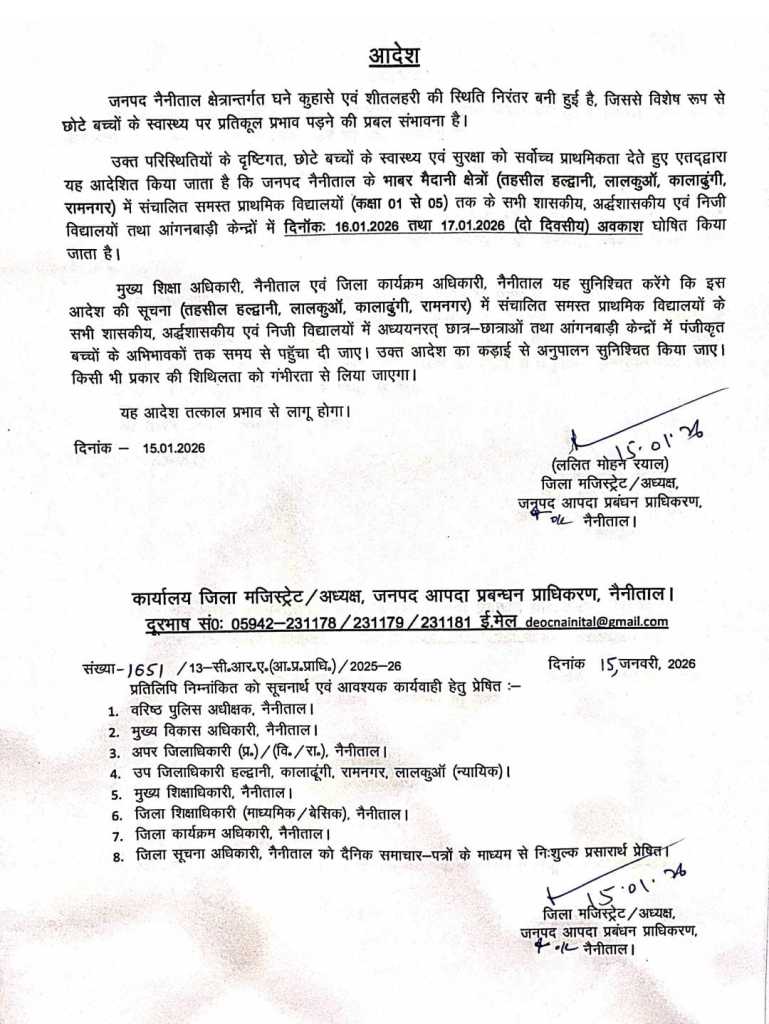 प्रशासन द्वारा जारी आदेश के अनुसार जनपद नैनीताल के भाबर मैदानी क्षेत्रों में आने वाली तहसील हल्द्वानी, लालकुआं, कालाढुंगी और रामनगर में संचालित सभी शासकीय, अर्द्धशासकीय एवं निजी प्राथमिक विद्यालयों (कक्षा 1 से 5 तक) के साथ-साथ समस्त आंगनबाड़ी केंद्र 16 जनवरी 2026 और 17 जनवरी 2026 को बंद रहेंगे।