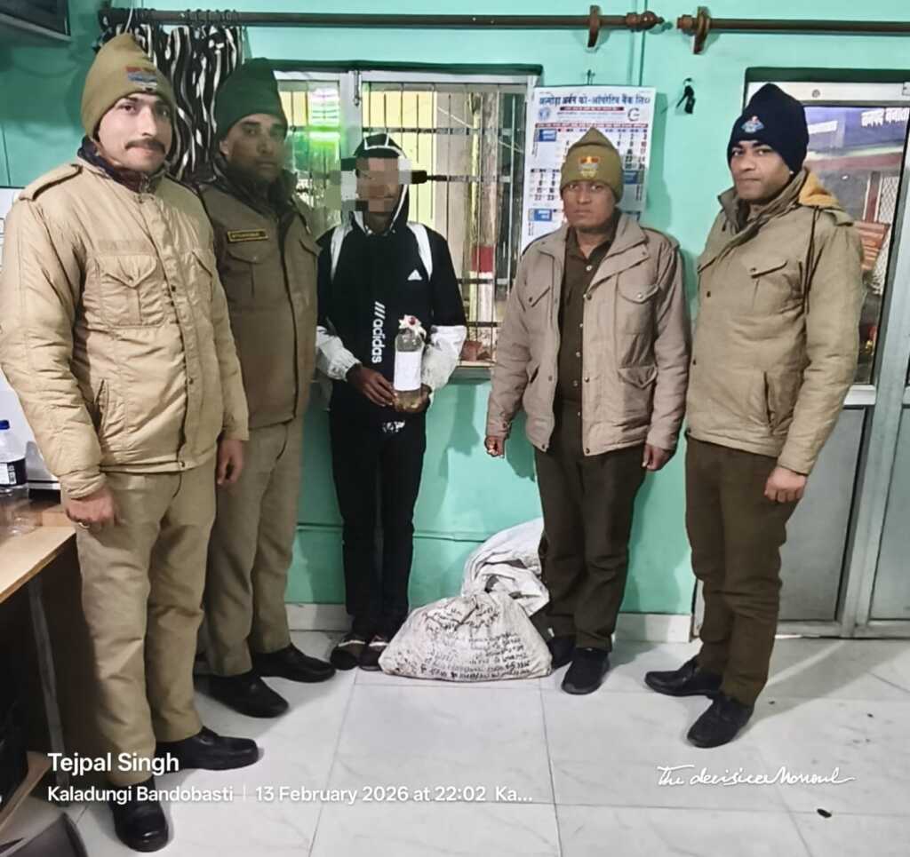 पुलिस अधीक्षक हल्द्वानी श्री मनोज कुमार कत्याल के मार्गदर्शन क्षेत्राधिकारी रामनगर श्री सुमित पांडे के पर्यवेक्षण तथा प्रभारी निरीक्षक कालाढूंगी श्री अरुण कुमार सैनी के नेतृत्व में पुलिस टीम द्वारा दिनांक 13.02.2026 को चैकिंग के दौरान निहाल नदी विदरामपुर चकलुवा क्षेत्र से एक व्यक्ति को 57 पाउच अवैध कच्ची शराब के साथ गिरफ्तार किया गया।